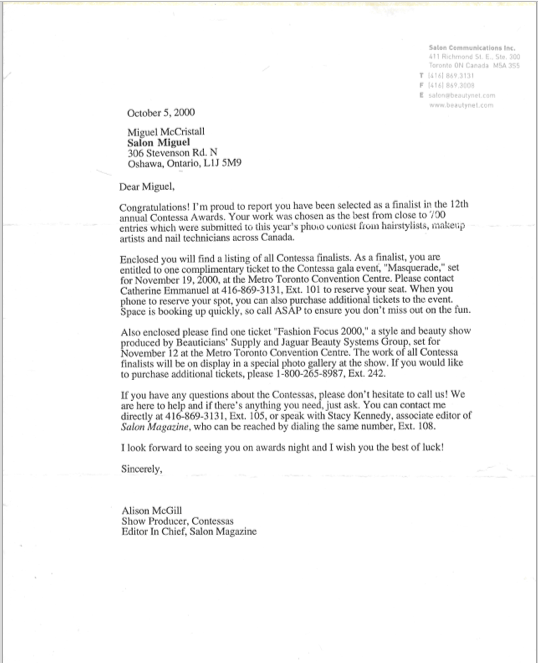 August 27, 2019September 13, 2019CindyLeave a Comment on Career Highlights: 12th Annual Contessa Awards Career Highlights: 12th Annual Contessa Awards In October 2000, Miguel received a letter from the Editor-in-Chief of Salon Magazine and Show Producer of Contessa, Alison McGill, congratulating him on his selection as a finalist in the 12th Annual Contessa Awards. Share this:TweetLike Loading... Related