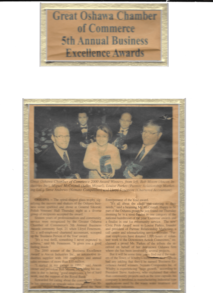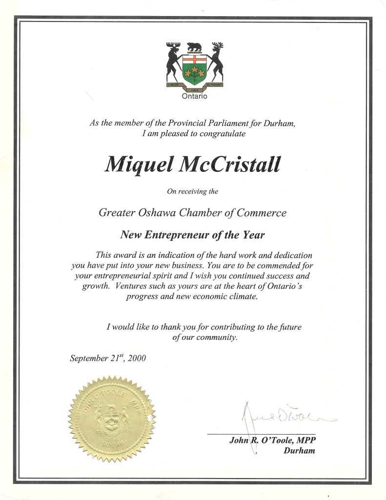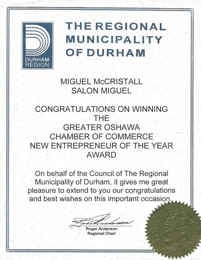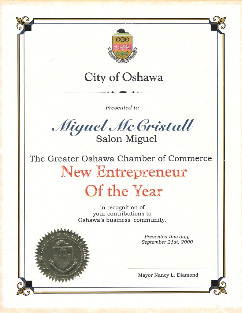 Less than three years after Miguel earned his hairstyling diploma, he had launched and grown Salon Miguel by leaps and bounds, earning him the coveted New Entrepreneur of the Year Award, a recognition from the Greater Oshawa Chamber of Commerce. To his excitement, Miguel also received congratulations from dignitaries and various offices: Office of the Regional Chair Roger Anderson for The Regional Municipality of Durham, the MPP of Oshawa Jerry J. Ouellette, the Office of the Mayor of City of Oshawa Nancy L. Diamond, and the Office of the Prime Minister Jean Chretien.
