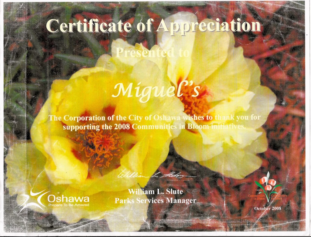 Among the many ways Miguel, through Salon Miguel, supported his hometown was to participate in Canada’s Communities in Bloom project in 2008. Miguel has a green thumb inherited from his mum, and he himself has landscaped and tended his own gardens. Here’s the Certificate of Appreciation Oshawa gave him.